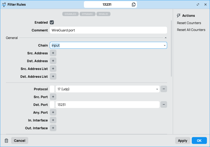 add action=accept chain=input comment="WireGuard port" dst-port=13231 protocol=udp