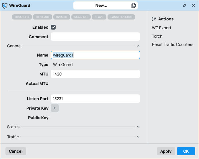 - copy the generated client public key to the mikrotik wireguard peer public key field