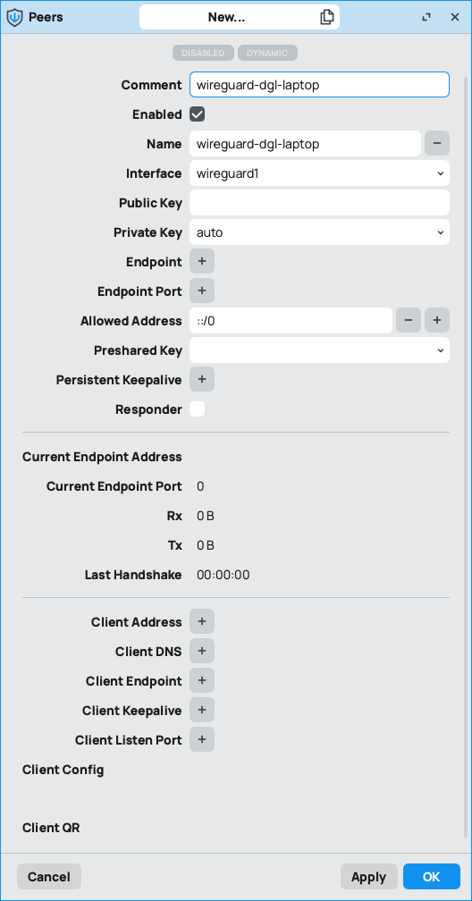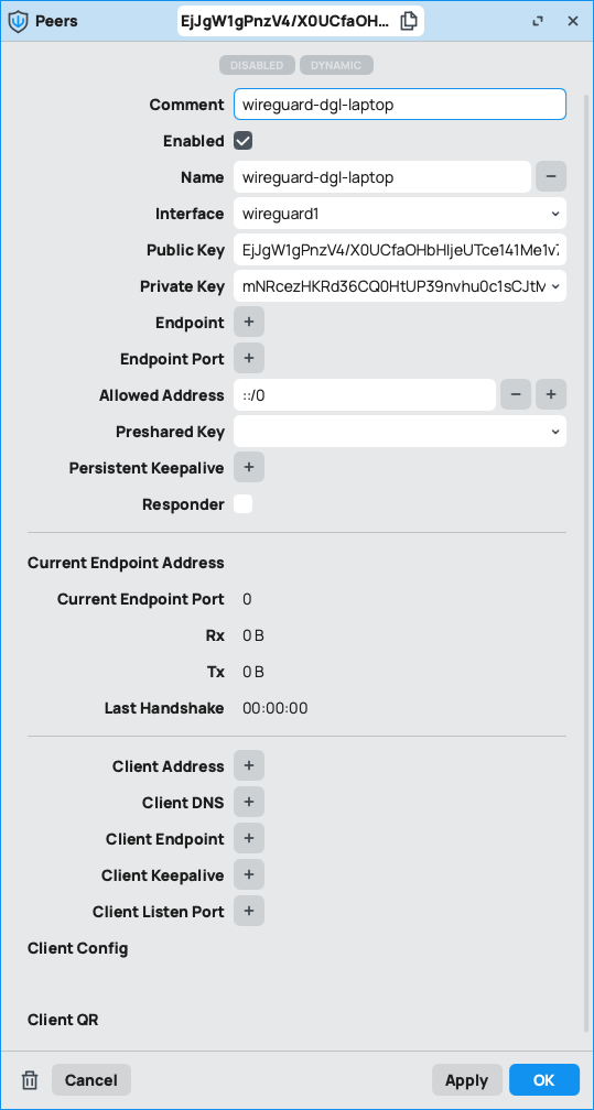 - copy the generated public key from the mikrotik wireguard interface to the client peer public key field